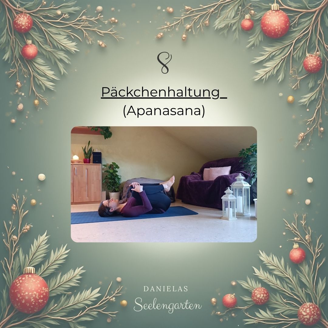 Schau für dich ob du in der Position passiv bleiben möchtest oder ob du über deinen unteren Rücken rollen magst und dir so eine kleine Massage schenkst.