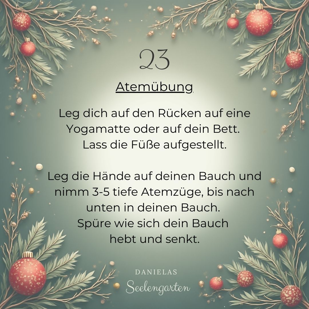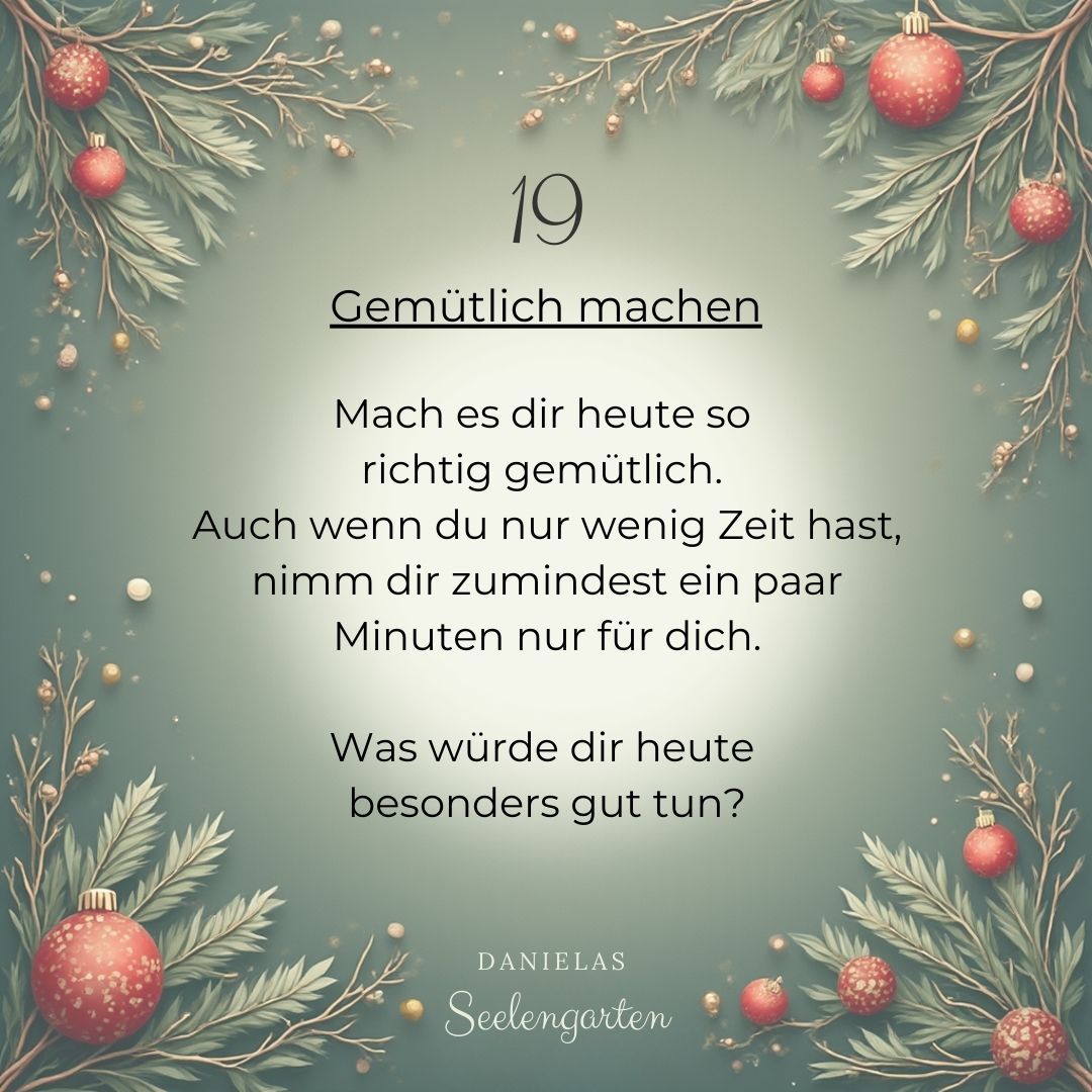 Passend zu meinem letzten Blogpost „Gelassen durch die Weihnachtszeit“ möchte ich dir in diesem Adventskalender ein paar schöne Ideen und Momente schenken für deine Weihnachtszeit. Eine kleine Auszeit für deine Seele, nur für dich, damit du dich in der Weihnachtszeit nicht selbst verlierst.